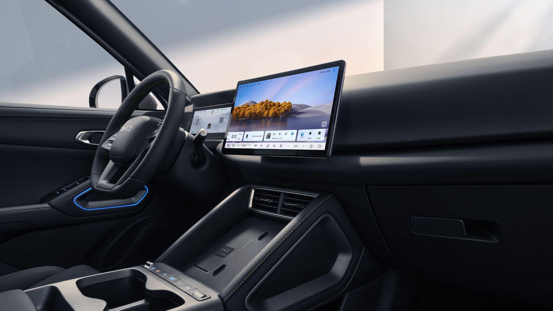 Kemasan interiornya pun sedikit beda dari versi EV dengan karakter gaya khas Eropa. Pada dashboard terpasang layar sentuh 12,8 inci penampil sistem multimedia terpadu. Panel instrumen menggunakan layar 8,8 inci.