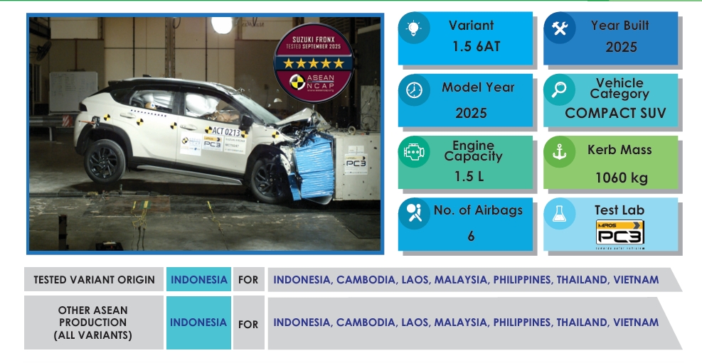 Suzuki Fronx berhasil melampaui rangkaian sesi uji tabrakan dan uji fitur keselamatan berkendara di bawah protokol penilaian ASEAN NCAP 2021-2025. Dengan skor total 77,7 poin, Suzuki Fronx terbaru hasil produksi Indonesia ini pun layak mendapat peringkat 5 bintang ASEAN NCAP.