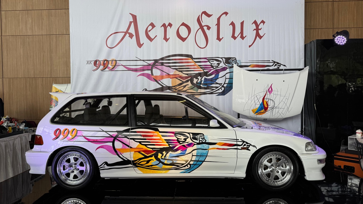 Mobil yang diberi nama ‘AeroFlux’ ini menjadi karya istimewa, hasil kolaborasi antara Rizki Kurniawan dan Freeflow.66. Bodi mobil tampil sangat atraktif, berkat goresan hand painting otentik, dari seniman kenamaan Mochamad Syamsul Fahmi (Freeflow.66).