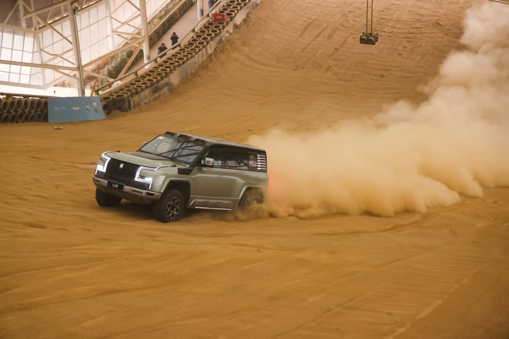 Kami pun secara eksklusif berkesempatan merasakan ketangguhan dari Yangwang U8 Hybrid untuk melibas bukit pasir dalam ruangan ini.