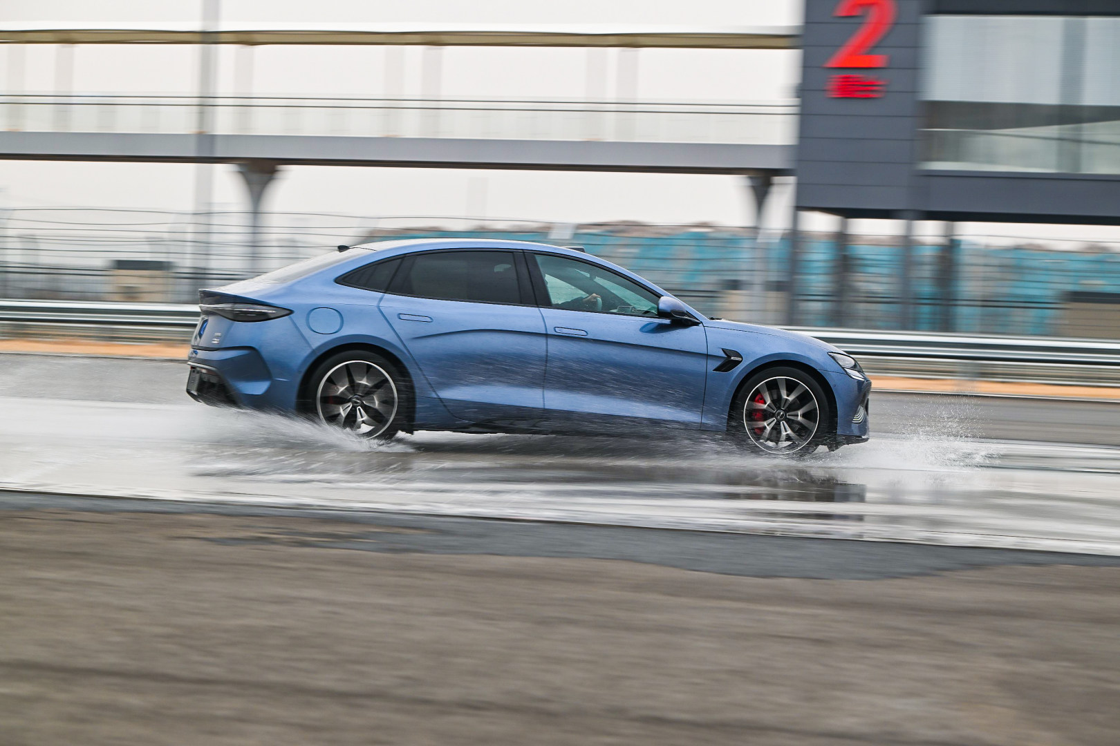 Oh ya, di sirkuit juga ada zona uji Kick-Plate dengan permukaan semen basah yang dipoles untuk mensimulasikan kondisi jalan yang licin. Terdapat pula pelat hisap yang dapat digerakkan untuk mensimulasikan hilangnya kendali akibat slip roda. Simulasi ini memungkinkan pengemudi merasakan situasi darurat yang kemungkinan terjadi di jalan dalam lingkungan uji yang terkontrol.