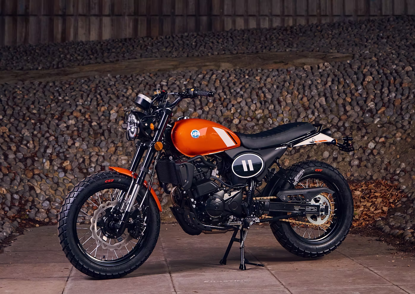 Tampilan retro ala Scrambler sangat kental dengan tangki gembung, setang lebar dan jok model rata. Speedometer digital model bundar, laras knalpot model megaphone dan head lamp LED model bundar disesuaikan dengan gaya modern yang kekinian.
