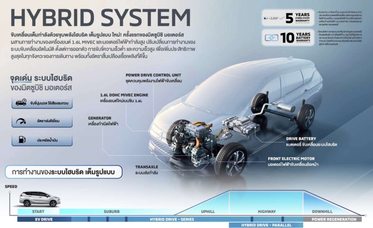 Xpander HEV mengandalkan mesin bensin 1.6-liter MIVEC dengan output 95 hp (96 PS) dan torsi 134 Nm. Mesin dipadukan dengan motor listrik berdaya 116 hp (117 PS) dan torsi puncak 255 Nm yang tersalur ke roda depan.