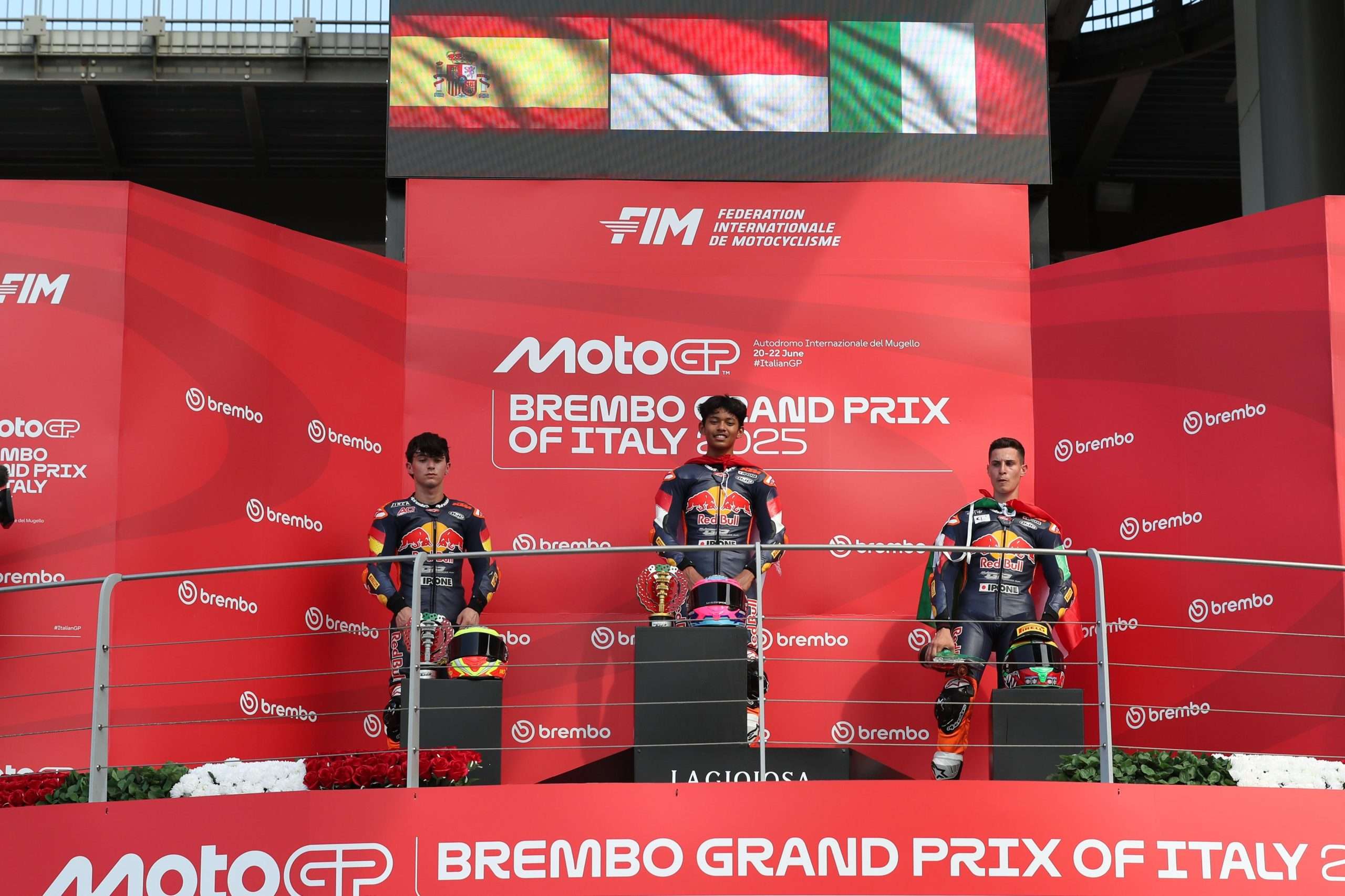 Pembalap muda Indonesia, Veda Ega Pratama, sukses raih podium satu di ajang Red Bull Rookies Cup (RBRC) 2025 (21/6/25) waktu Italia.